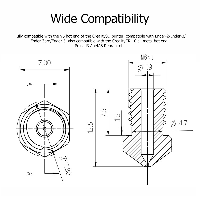 A medida 1,75mm é referente à espessura do filamento compatível com este nozzle para impressora 3D.