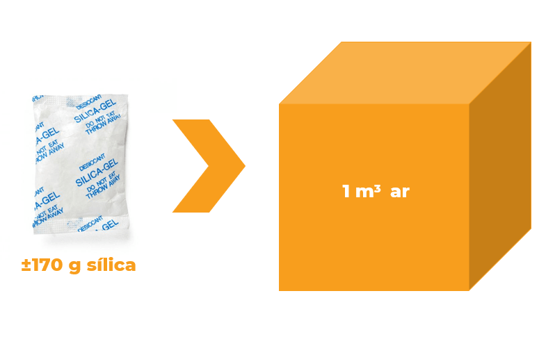 Para facilitar, e usando uma regra simplista, podemos considerar que para desumidificar 1000 litros de ar, são necessários cerca de apenas 170g de sílica-gel.