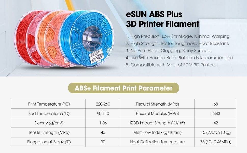 O filamento ABS+ ESUN é compatível com quase todas as impressoras 3D, incluindo impressoras RepRap e MakerBot, Ultimaker, Bits from Bytes, Airwolf3D, Makergear, Printrbot, Bukobot, Creality, Type A Machines e muitas mais.