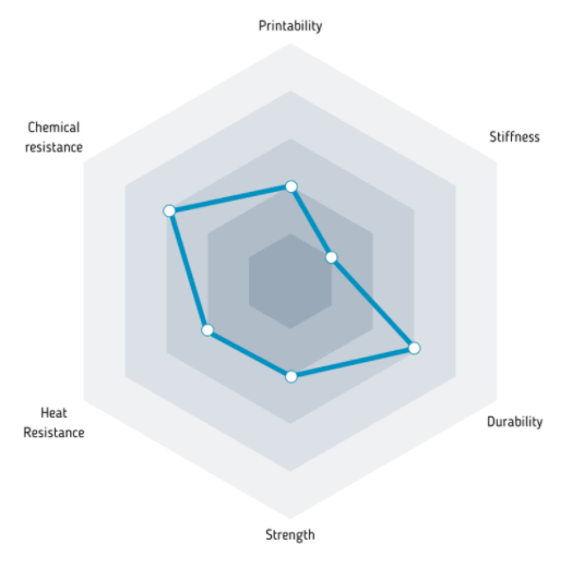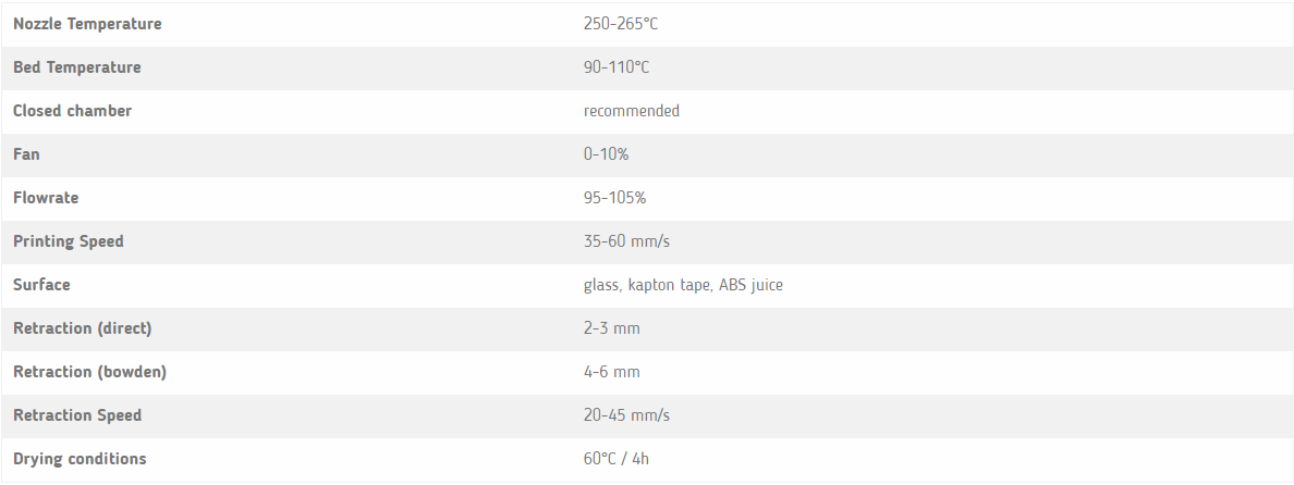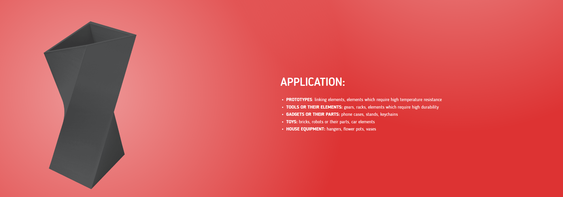 As impressões feitas com este filamento são caracterizadas pela sua dureza e alta resistência ao impacto. Resistentes a altas temperaturas e abrasão.