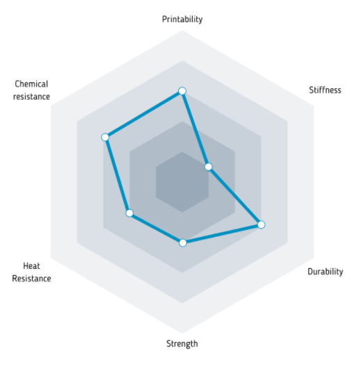 As impressões feitas com este filamento são caracterizadas pela sua dureza e alta resistência ao impacto. Resistentes a altas temperaturas e abrasão.