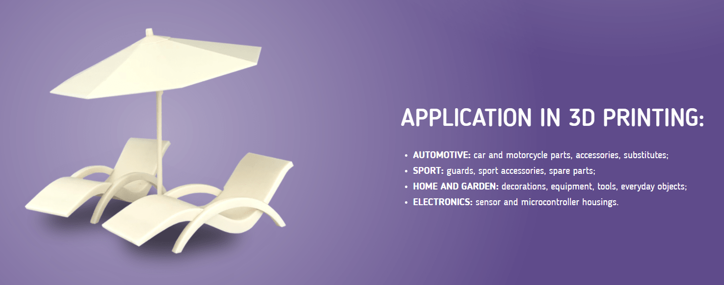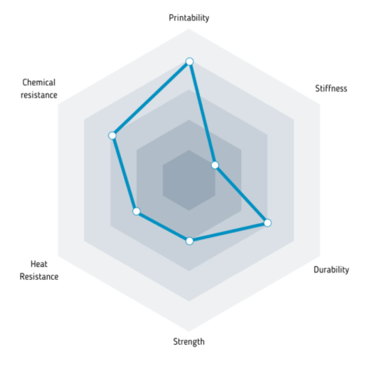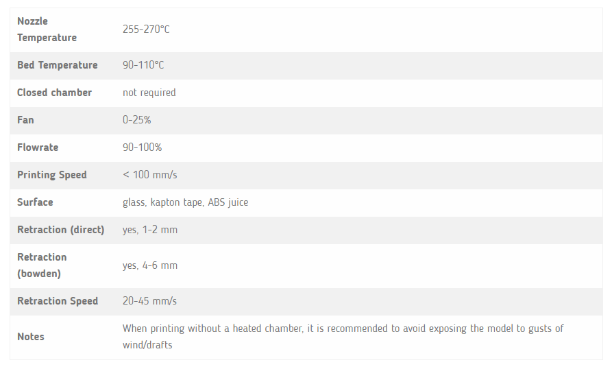 A alta resistência mecânica e térmica (até 94 ° C) e a facilidade de impressão fazem deste material um ótimo substituto do ABS, garantindo sua popularidade na indústria automotiva e na produção de itens do quotidiano.