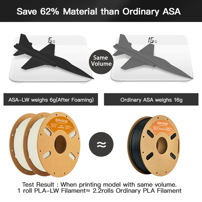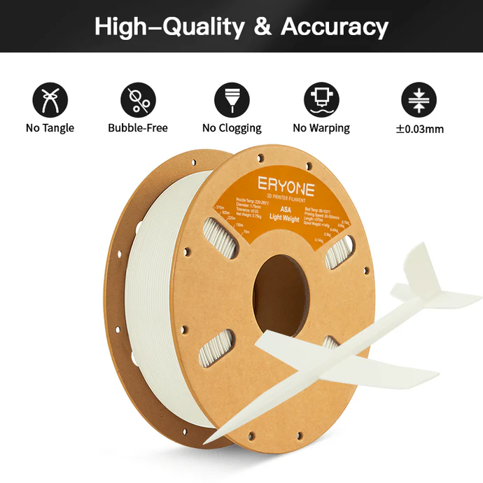 O filamento leve ASA da Eryone é um material de impressão 3D de alto desempenho que combina alta resistência, elevada resistência ao impacto e características ultra-leves e de baixa densidade.