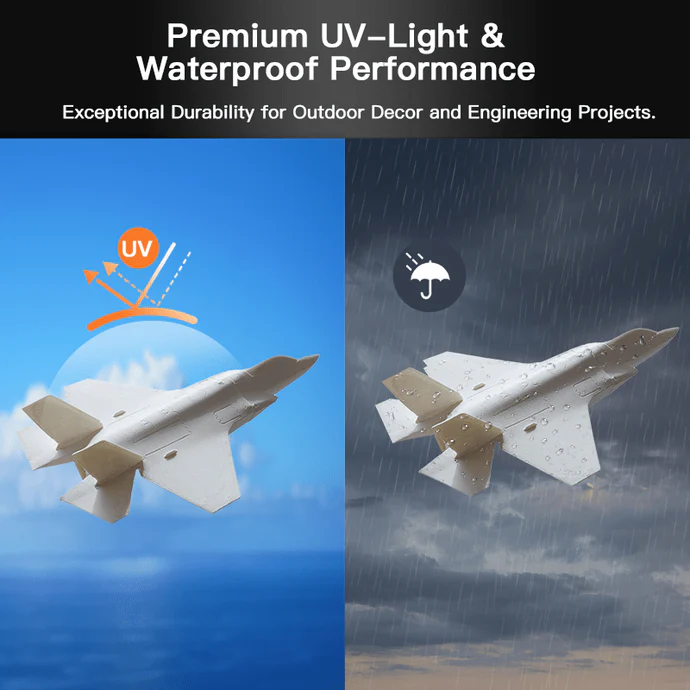 Graças à sua excelente resistência à água e proteção contra raios UV, garante estabilidade a longo prazo em ambientes externos, evitando os problemas comuns de fragilidade e degradação encontrados em materiais como o PLA.