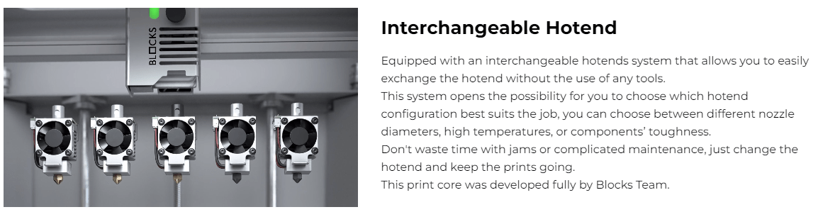 - Print Core de troca fácil – Equipado com um sistema de hotend trocável que permite ao utilizador trocar facilmente o hotend sem o uso de quaisquer ferramentas