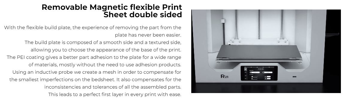 - Cama Fléxivel e Magnética – Cama quente e magnética com uma base de impressão flexível composta por um lado liso e um lado texturizado com revestimento PEI.