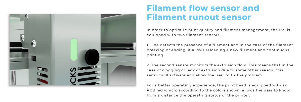 - Sensor de filamento – Equipada sensor de fluxo e de falta de filamento para otimizar a qualidade de impressão e gestão do filamento