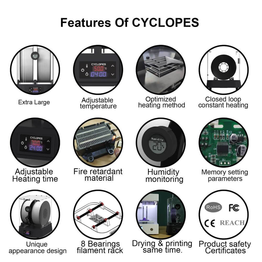 - Em comparação com outros secadores de filamentos 3D, CYCLOPES tem um grande espaço interior, Pode utilizar 4 rolos de filamentos 0,5kg/2 rolos de filamentos 1kg/1 rolo de filamentos 3kg ao mesmo tempo, adequado para filamentos multiformato que incluem 1,75mm/2,85mm/3mm.