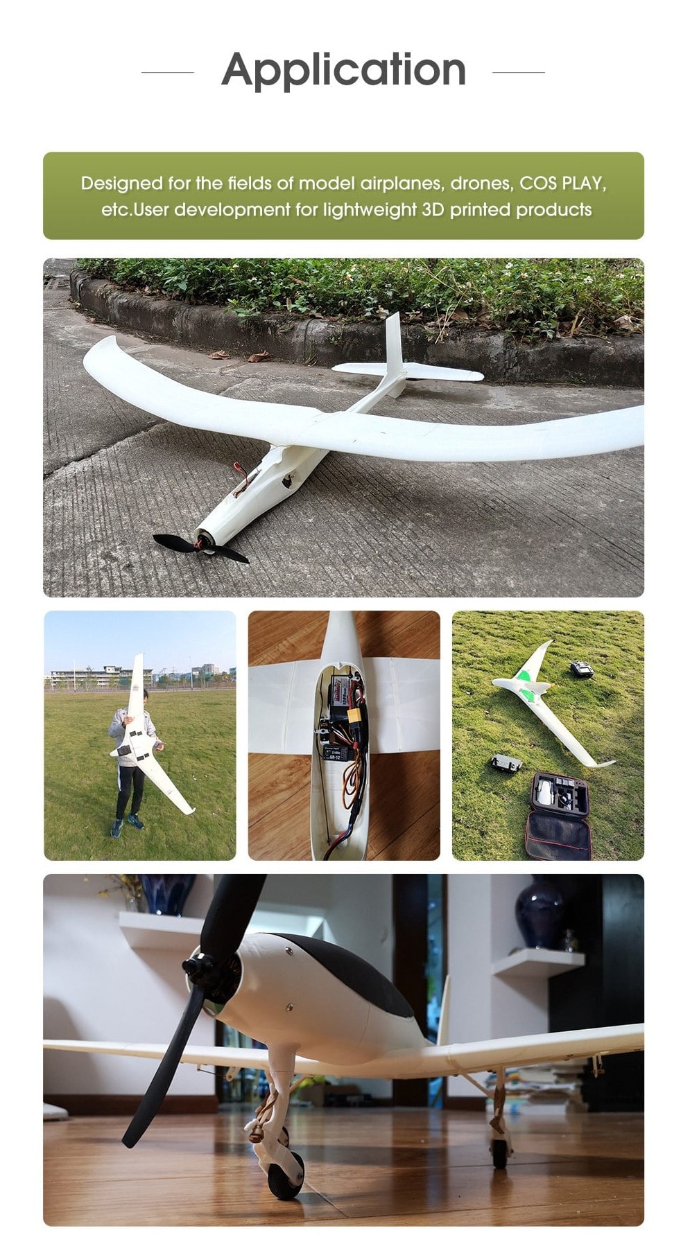 Aplicação – Tecnologia de espuma activa é utilizada para realizar peças PLA leves e de baixa densidade, especialmente concebidas para os campos dos aviões modelo, drones e COSPLAY.
