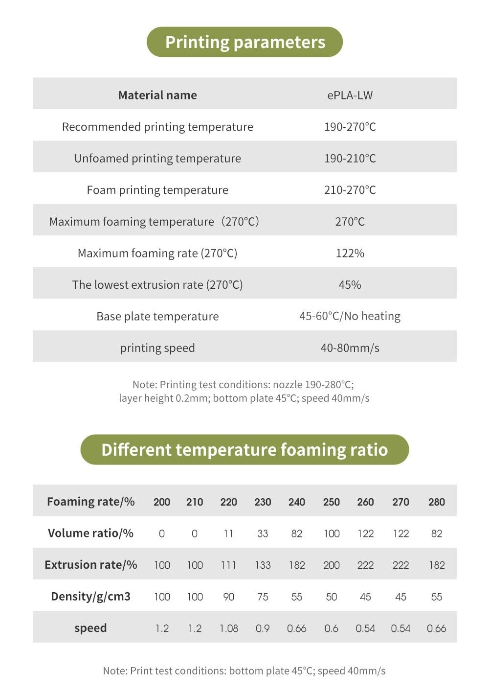 A relação do volume de espuma é de 220%, e 1 rolo de ePLA-LW é equivalente a 2.2 rolos de PLA comum