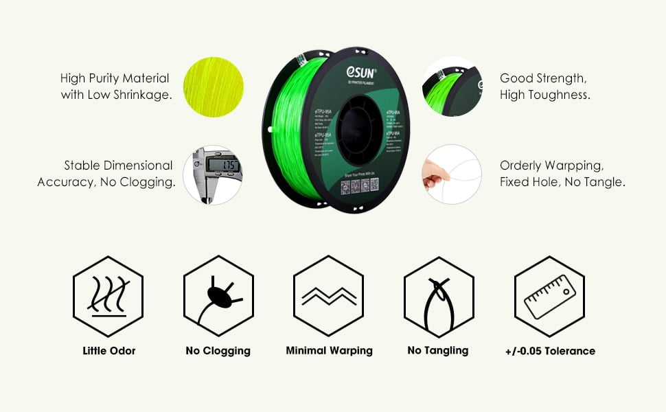 O filamento TPU flexível permite movimentos ou impacto repetidos sem usar ou rachar, que imprime partes fortes que também são flexíveis.