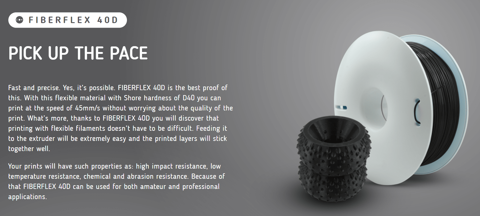 Um elastómero termoplástico com uma dureza de 40D na escala shore, que pode ser impresso a velocidades até 45 mm/s. O material em forma de borracha pode ser estendido até 680% das suas dimensões originais. Além disso, tem uma alta resistência ao impacto a baixas temperaturas e é resistente à abrasão e tem uma resistência química muito boa. Todas as propriedades materiais dão a oportunidade de usá-lo em lugares que requerem dobragem frequente, em gadgets, bem como partes de borracha de máquinas e elementos de união.
