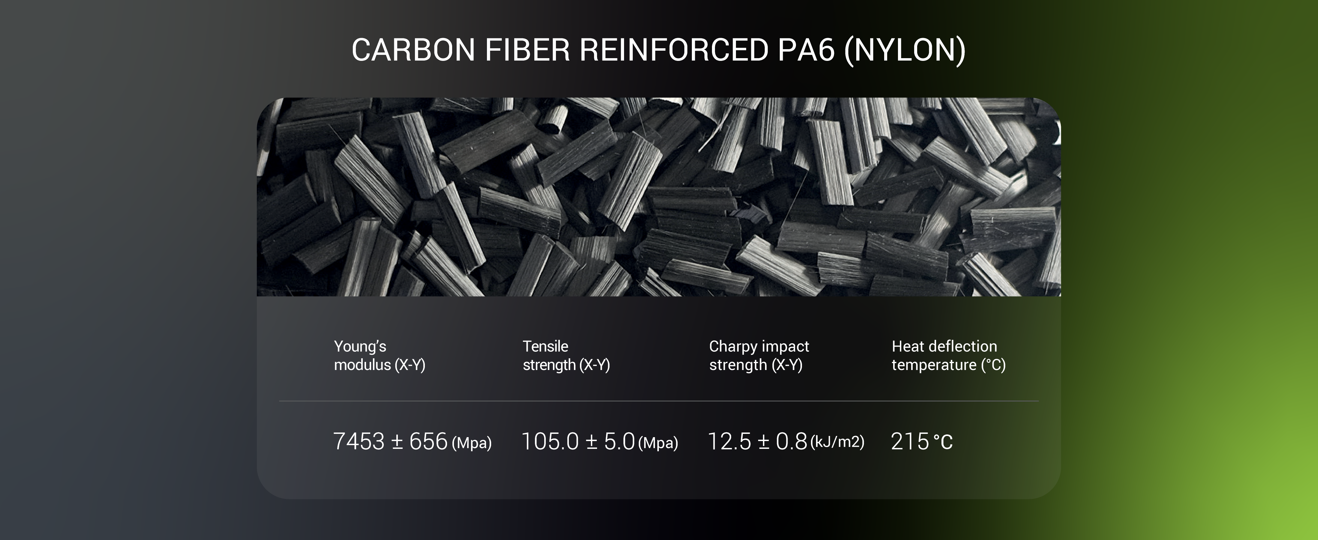 O Fiberon™ PA6-CF20 é um filamento de PA6 (Nylon 6) reforçado com fibra de carbono. O reforço de fibra de carbono proporciona melhorias significativas na rigidez, resistência mecânica e resistência térmica, com uma excelente adesão entre camadas.