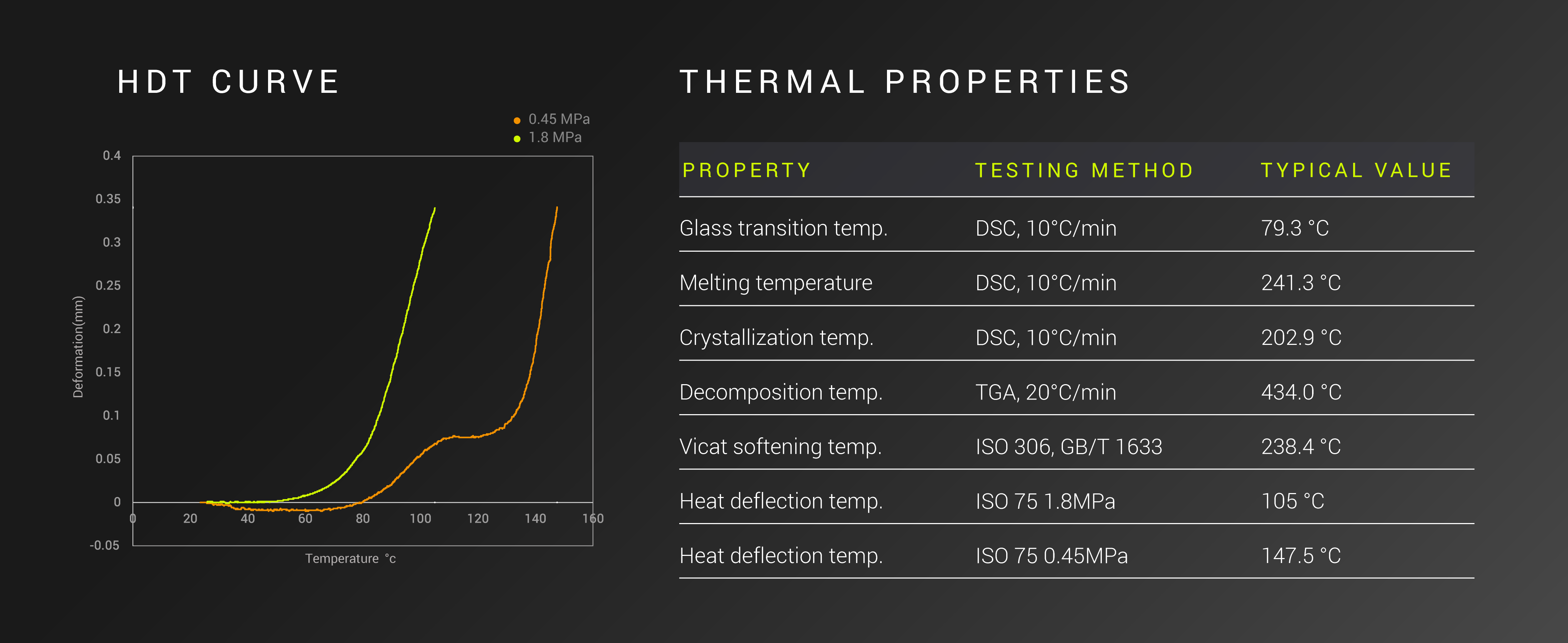 O recozimento melhora significativamente a resistência térmica do PET-CF17, elevando a temperatura de deflexão térmica (HDT) de cerca de 70 °C para mais de 100 °C.