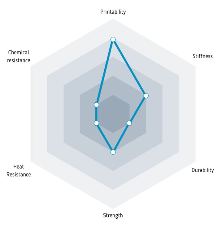 O filamento PLA é um polímero estável, permanente e inodoro. Como contrapartida do PLA em relação ao ABS cabe mencionar que a sua temperatura de amolecimento é de 60ºC em relação aos 100ºC do ABS.