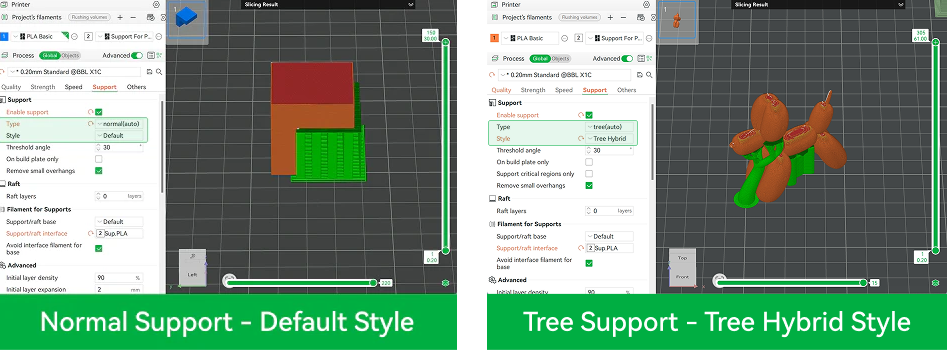 • Para modelos mais complexos, opta pelo tipo de suporte “Árvore” com o estilo “Híbrido de Árvore”.