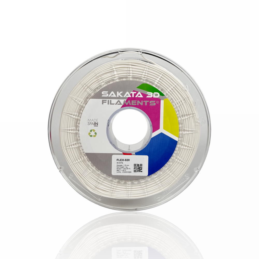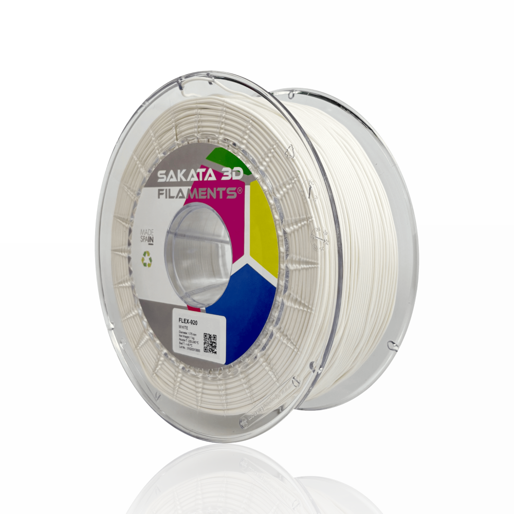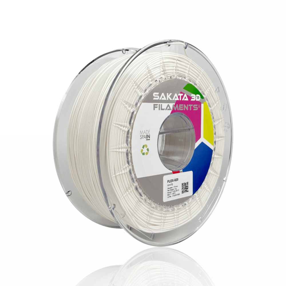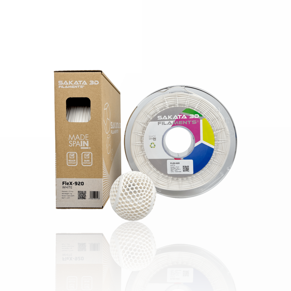 O FleX-920 é um filamento flexível desenvolvido pela Sakata 3D Filaments, sendo um produto único no mercado. Este material, 100% biodegradável e compostável, surge como uma alternativa ao TPU/TPE graças às suas propriedades elásticas. Além disso, oferece a mesma facilidade de impressão que o PLA. Este filamento inovador permite-te criar peças com um elevado grau de flexibilidade (89 Shore A).