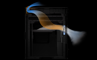 A saída superior com ventilação filtrada introduz ar fresco, permitindo imprimir PLA/PETG e lidar com overhangs sem necessidade de abrir as portas.
