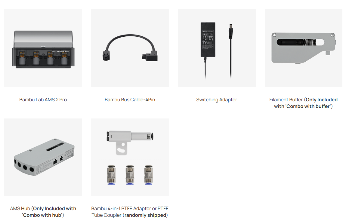 Combo includes: P1S, AMS 2 Pro, 4-Pin Bus Cable, Switching Adapter, Filament Buffer and Bambu 4-in-1 PTFE Adapter(or PTFE Tube Coupler).