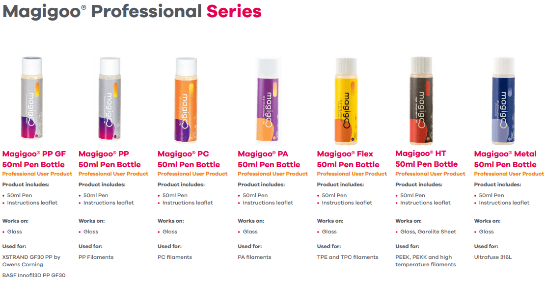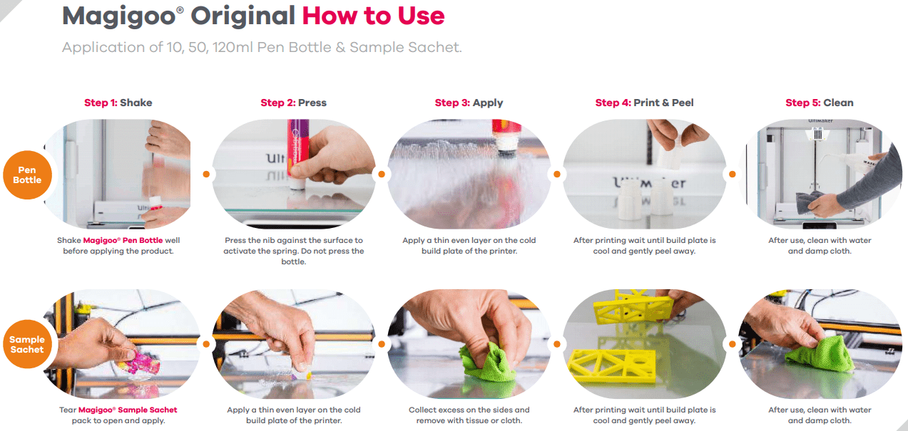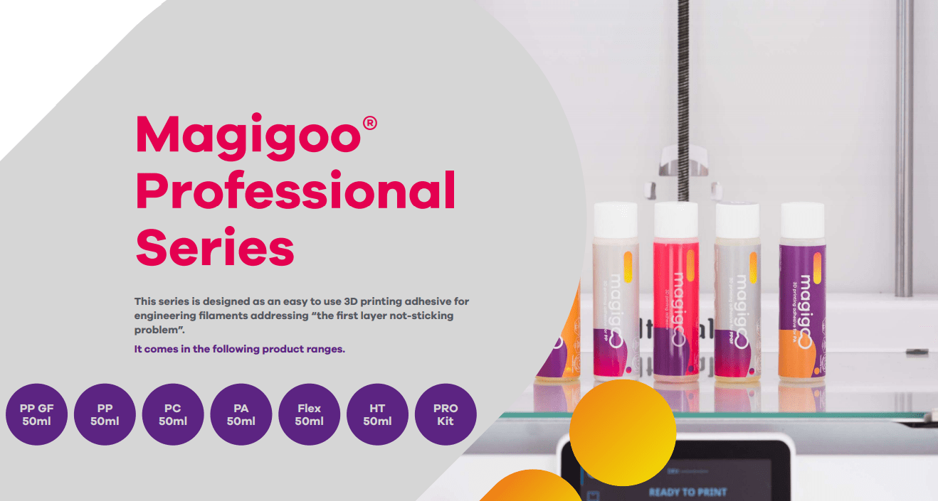 Magigoo é a nova geração de componentes de aderência à base de impressão 3D. Os produtos de geração anterior eram em formato de spray, que precisam de ser pulverizados com a base fora da impressora 3D para evitar a deterioração dos componentes da impressora 3D, contaminam o ambiente e são irritantes se utilizados em locais fechados.
