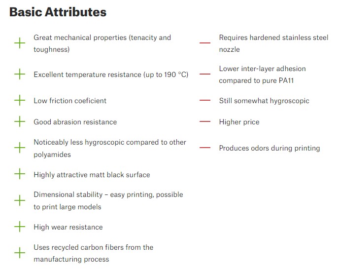 O Prusament PA11 Carbon Fiber Black é uma poliamida 11 preenchida com fibras de carbono recicladas, o que a torna muito resistente e durável sem a tendência para deformar (uma questão comum com PA12). Este material oferece grandes propriedades mecânicas, alta durabilidade e resistência a altas temperaturas (até 190 °C). É também resistente a uma série de solventes, tais como hidróxido de sódio (NaOH), metanol, etanol, tolueno, acetona, óleos de motor, gasolina, etc.