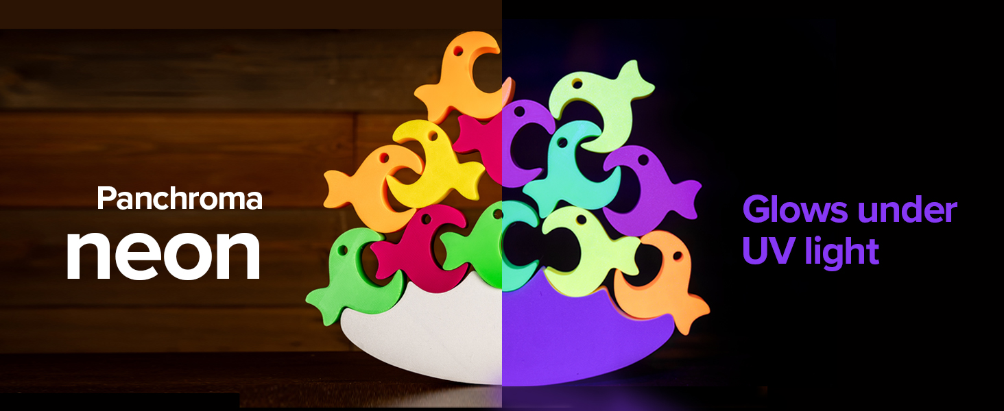 - Panchroma™ Neon PLA mantém a mesma cor visível com ou sem luz UV.