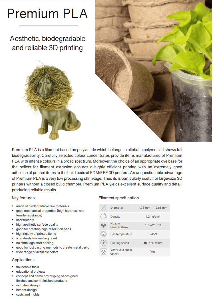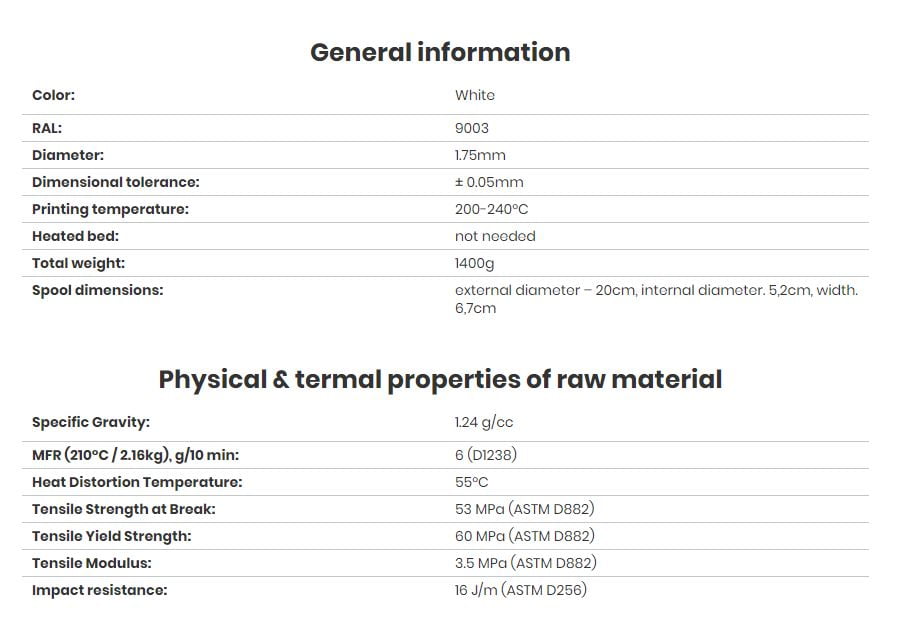 O filamento PLA é um polímero estável, permanente e inodoro. Como contrapartida do PLA em frente ao ABS cabe mencionar que a sua temperatura de amolecimento é de 60ºC em frente aos 100ºC do ABS .