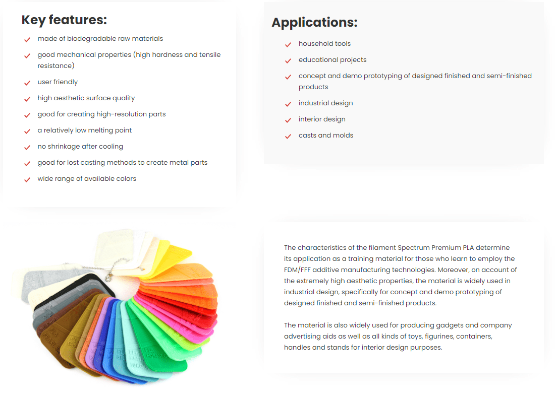 As suas propriedades permitem a impressão de elementos precisos e de formas complexas, sendo que o PLA pode ser utilizado para criar protótipos funcionais, gadgets, brinquedos e objectos decorativos.
