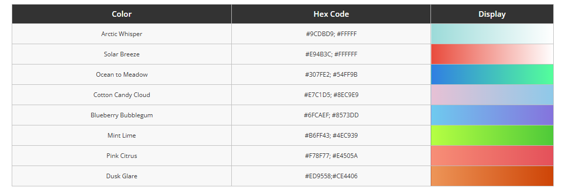 Tabela de Códigos Hexadecimais do PLA Basic Gradient
