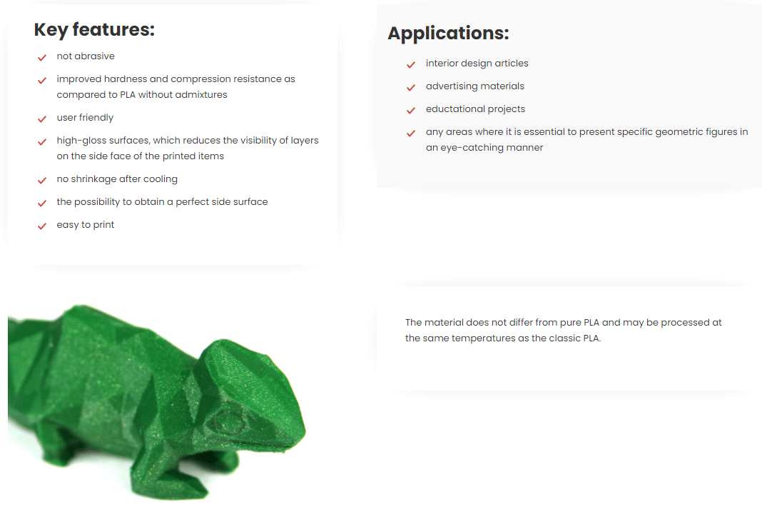 As suas propriedades permitem a impressão de elementos precisos e de formas complexas, sendo que o PLA pode ser utilizado para criar protótipos funcionais, gadgets, brinquedos e objectos decorativos.