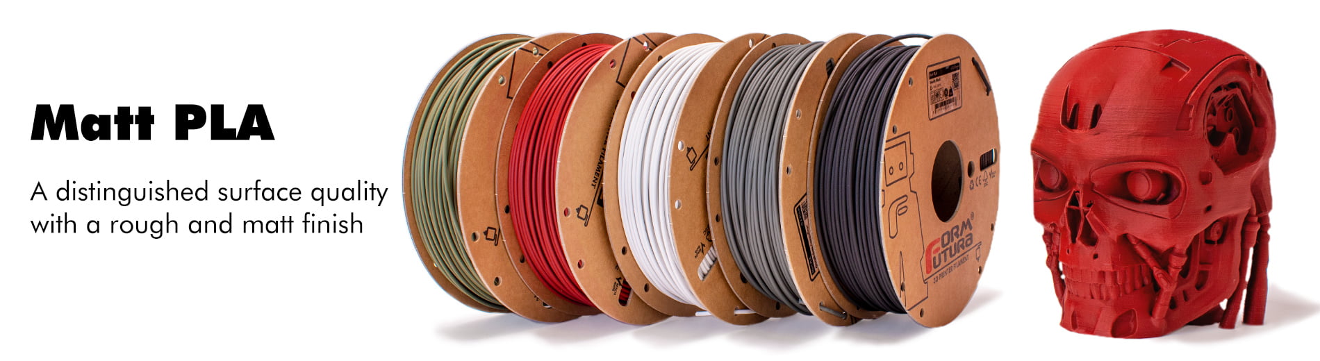 FormFutura Matt PLA filament contains more than 50% recycled post-industrial PLA content sourced from the waste streams that arise during the extrusion or our EasyFil PLA filaments. Because of its high recycled content, Matt PLA filament is not made from a virgin natural PLA compound, but from a homogeneous compound made from a wide variety of colors from collected filament extrusion waste. Homogeneous compound runs can vary slightly in color intensity. This may result in slightly lighter or darker 3D printing filament colors extruded from various homogeneous compound runs. On average two to three homogeneous compound runs are made per year.