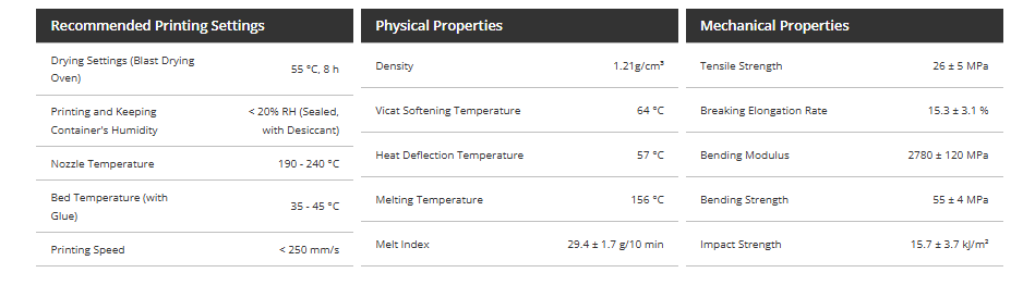 | Recommended Printing Settings | Physical Properties | Mechanical Properties |