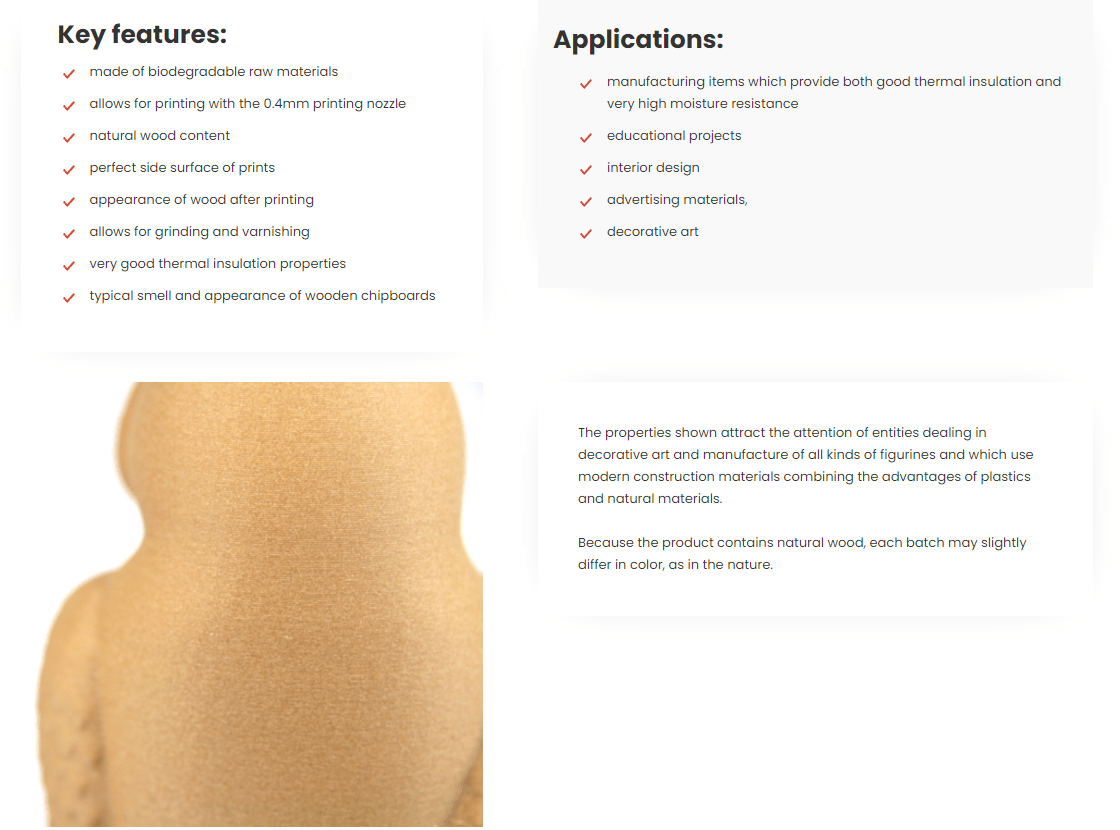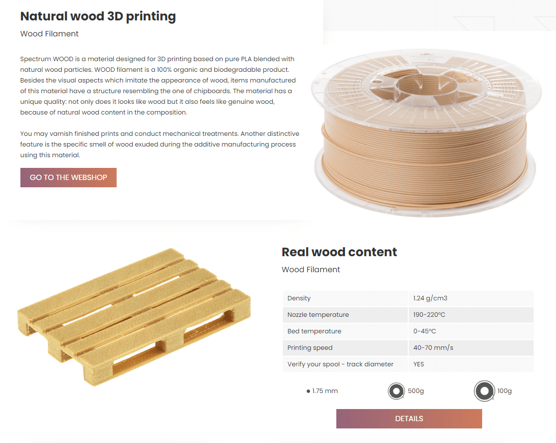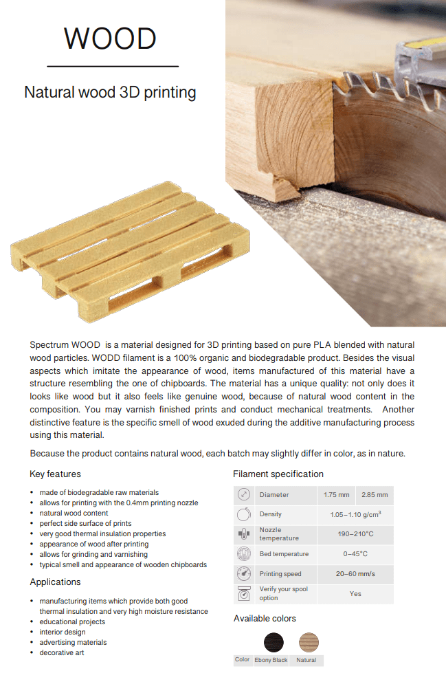 O Spectrum PLA WOOD é um material projetado para impressão 3D baseado em PLA puro misturado com partículas de madeira natural.