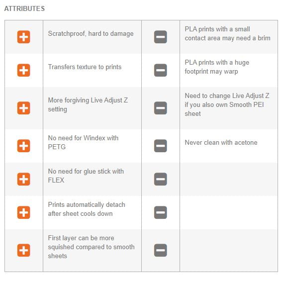 Never clean the Textured PEI Powder-coated spring steel sheet with acetone! Doing so will create microfractures in the PEI texture, which will make the surface deteriorate over time. Learn more about printing on the Textured PEI Powder coated steel sheet on our Blog.