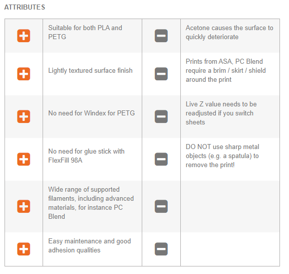 Policarbonato – imprime melhor em cetim (em comparação com folhas lisas e texturizadas) – quando se imprime frequentemente com PC, recomenda-se a camada de cola em bastão para evitar possíveis danos na folha.