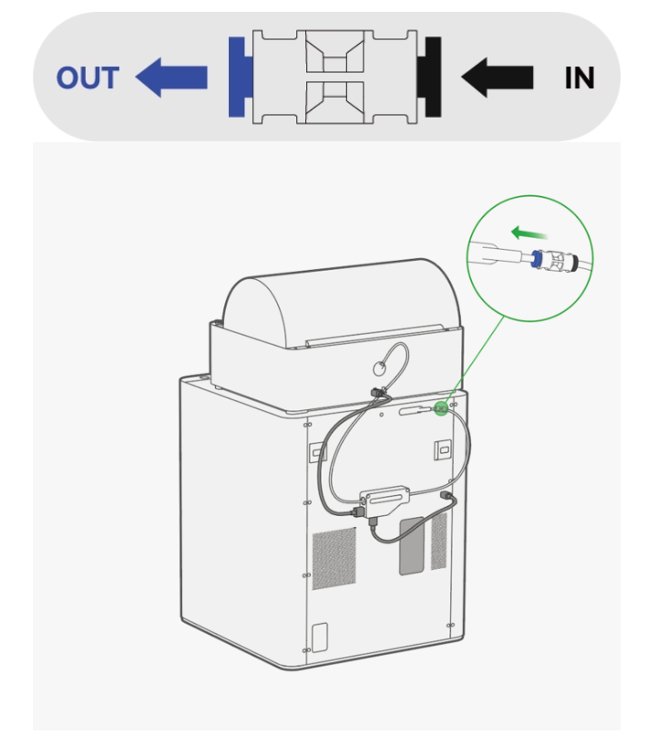 1. O tubo conector PTFE foi concebido com uma clara direcção de utilização, como mostra a figura abaixo. Ligar o tubo PTFE da saída do tampão à extremidade IN, e o tubo PTFE da cabeça da ferramenta à extremidade OUT. É importante notar que as ligações invertidas podem causar bloqueio de material, pelo que é essencial assegurar que a direcção de instalação esteja correcta.