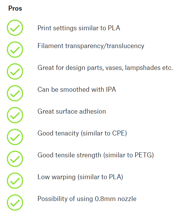 Os parâmetros de impressão são semelhantes ao PLA, as propriedades mecânicas são ligeiramente melhores (semelhantes ao CPE ou PETG).