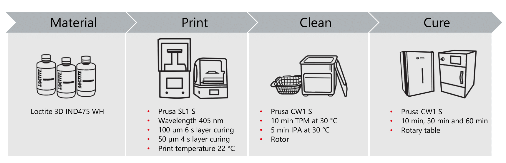 Depois de um processo de validação exaustivo da empresa Henkel em conjunto com a Prusa Research, apresentamos-lhe a resina branca Loctite 3D IND475 A60 High Rebound. Validámos não só que pode imprimir esta resina avançada na Prusa SL1S SPEED original, mas também que, ao seguir o fluxo de trabalho específico de pós-processamento, pode confiar nas propriedades mecânicas da impressão definidas pelo fabricante.
