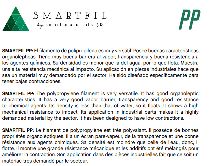 O polipropileno (PP) é um dos polímeros mais utilizados na indústria. A sua elevada flexibilidade, durabilidade incrível, baixo peso e resistência aos produtos químicos fizeram com que encontrasse inúmeras aplicações da medicina, passando pela indústria automóvel para a indústria de embalagens. O filamento PP de fibra de vidro aproveitou o potencial deste material incrível e tornou possível a utilização na impressão 3D.