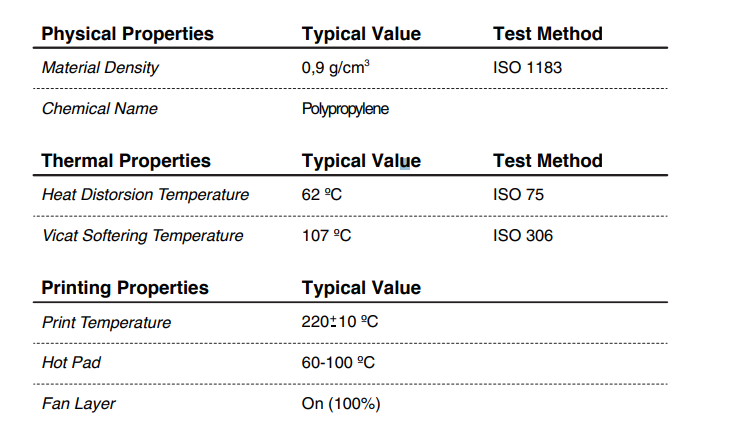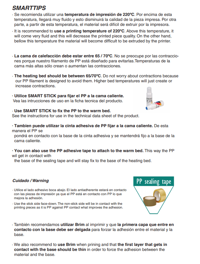 Este material é considerado de difícil aderência à superfície da plataforma de impressão 3D de vidro ou PEI. Para evitar problemas de warpping e de aderência das peças, recomendamos a aplicar potenciador de aderência especial para PP.