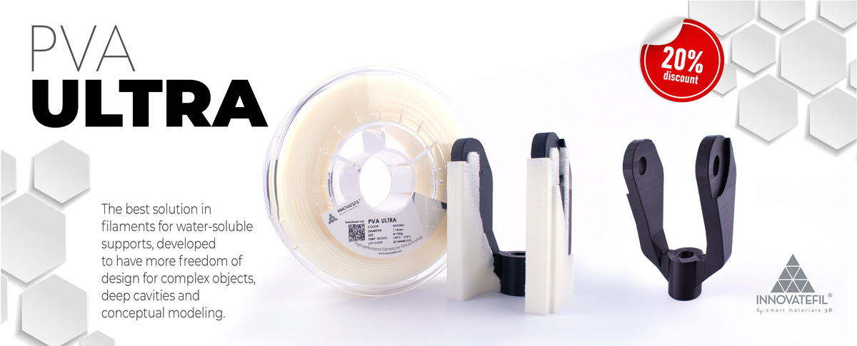 INNOVATEFIL® PVA ULTRA é a nossa fórmula solúvel em água de primeira classe de PVA, com a adição de aditivos, conseguimos aumentar a qualidade de impressão a outro nível para imprimir objectos sem defeitos, estabilizar o material e melhorar o seu comportamento contra a degradação térmica, este filamento como suporte alarga a gama de compatibilidade do material, pode ser utilizado com PLA, ABS, PETG, PA, CPE, entre outros.