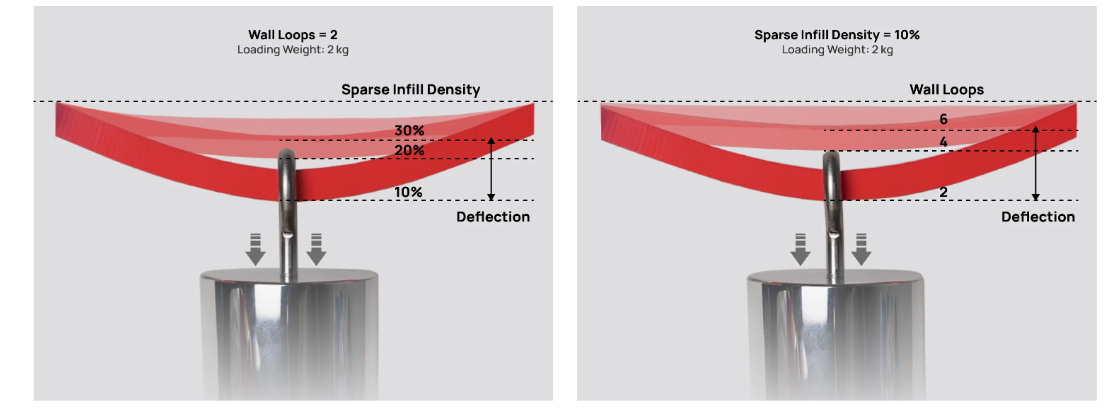 A elasticidade das impressões em TPU está relacionada com as definições de Wall Loops (Nº de Paredes) e Sparse Infill Density (Densidade de Preenchimento Espassado). Quanto maior for o número de paredes ou a densidade de preenchimento espassado, menor será a elasticidade, e vice-versa.